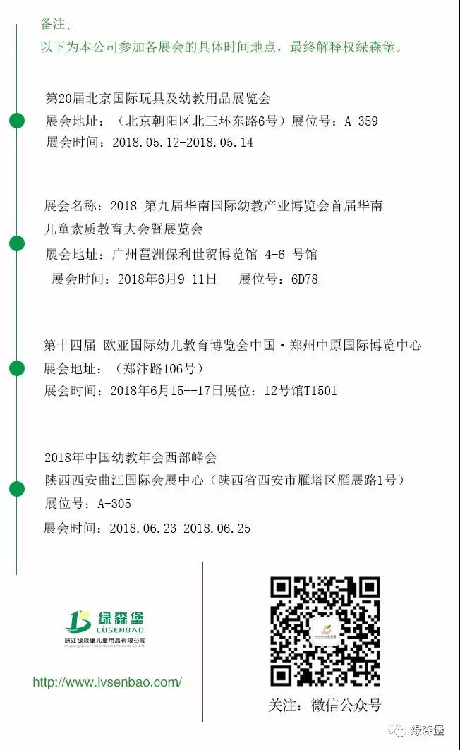 (浙江綠森堡兒童用品有限公司)專注幼教設施整體解決方案;此次北京展會,綠森堡將攜眾多設計新穎 質量過硬的產品驚艷亮相,屆時與廣大客商共襄盛舉,共同探討行業發展潛力和未來趨勢;一直以來,綠森堡始終致力于推動學前教育質量提升與交流、創新與展,贏得了教育同仁的認可和贊譽,時刻關注中國幼教市場的更新與發展,致力于向全國乃至世界推廣具有中國優秀傳統文化特色的幼教產品!